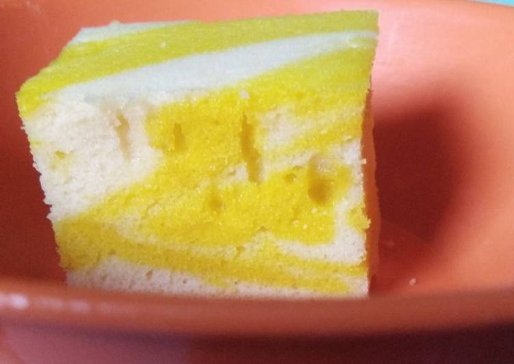 - Tuang separuh adonan putih ke dalam loyang kemudian adonan rasa durian secara bergantian, kukus selama 30 menit. Tes tusuk menggunakan lidi, sampai tidak menempel. Angkat sajikan..